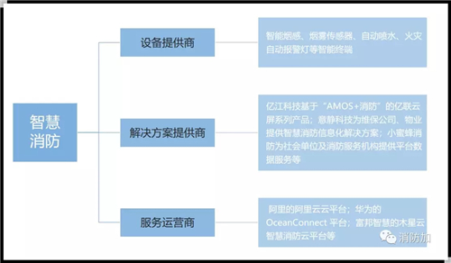 在建设智慧城市的过程中,智慧消防企业组成了初具规模的集研发设计、生产、销售、工程与系统集成、报警运营与运维服务等为一体的基础,大致可分为“设备提供商、解决方案提供商、服务运营商”三类企业形态。