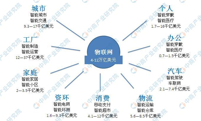 目前,物联网主要应用于个人、办公、汽车、物流、消费、资环、家庭、工厂和城市九大方面,全球物联网产值4—12万亿美元,涉及生活与工作方方面面。其中,智能城市、智能交通、智能穿戴、智能医疗市场最为可期。