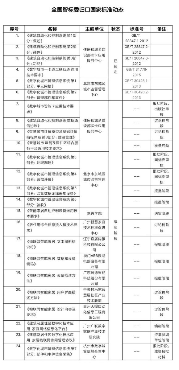 全国智能建筑及居住区数字化标准化技术委员会(SAC/TC426)(简称“全国智标委”)。全国智标委于2008年由国家标准化管理委员会批准(国标委综合[2008]108号)成立,由住房和城乡建设部负责业务指导的技术标准组织。全国智标委作为城市建设领域信息化产品标准国内唯一归口单位,主要负责智能建筑物数字化系统领域国家标准的制修订工作,其工作领域与国际标准化组织建筑物环境设计技术委员会建筑物控制系统设计工作组(ISO/TC205/WG3)相关联。主要围绕智慧城市、智慧社区、数字城管、智能家居等方面开展关键技术标准研究、归口管理及应用示范推广工作。