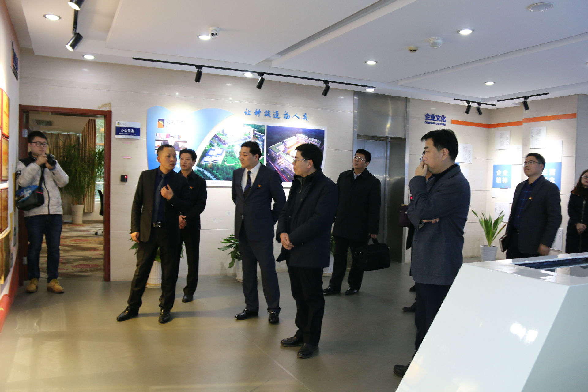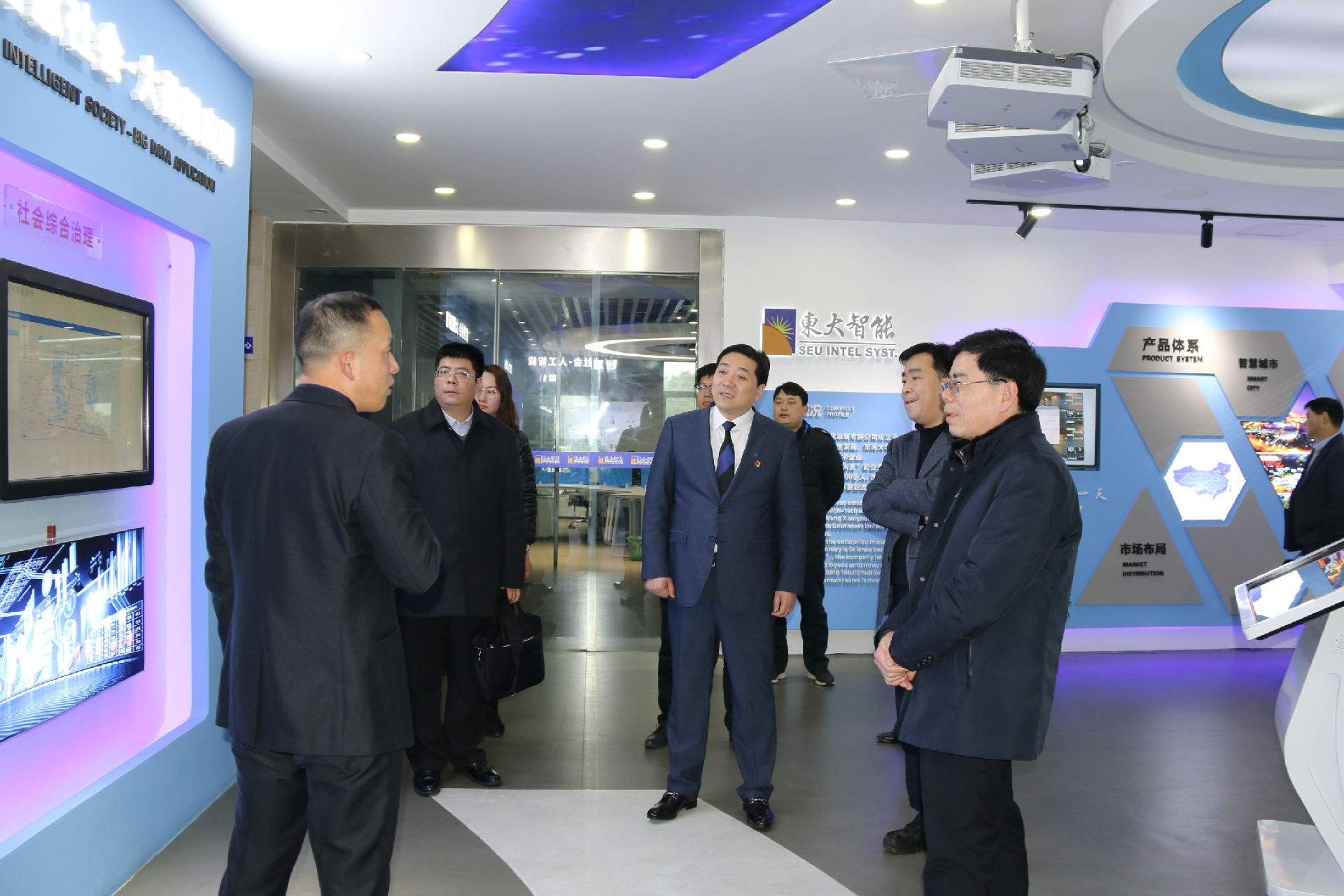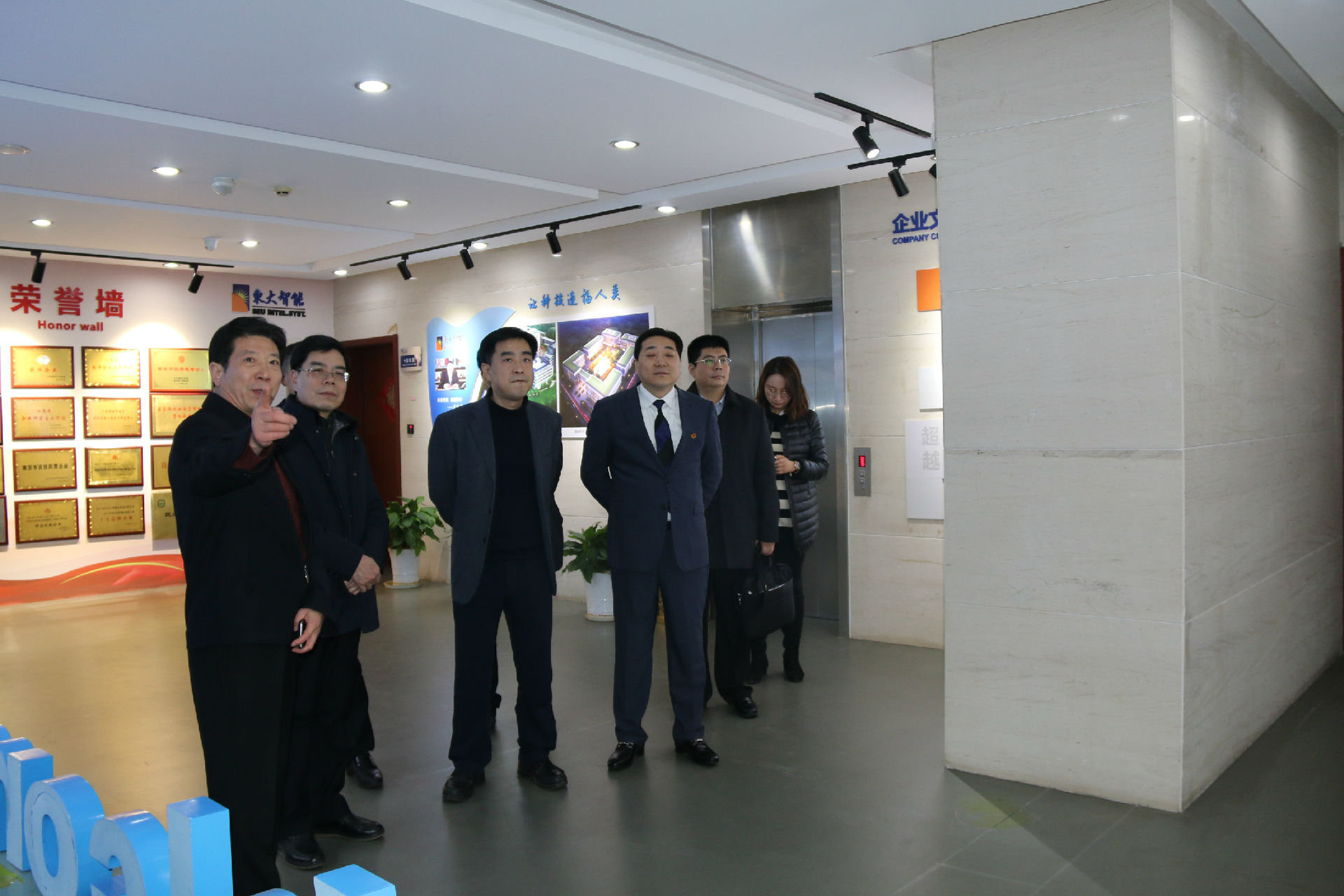 2019年2月20日下午,南京市委组织部常务部长张新年、人才二处处长范薇、人才三处处长伍洋一行三人,在玄武区区委常委、组织部部长张惠民及副区长、徐庄高新区党工委书记、集团党委书记李大海等领导的陪同下莅临东大智能,对公司的发展情况及党建工作进行调研考察。