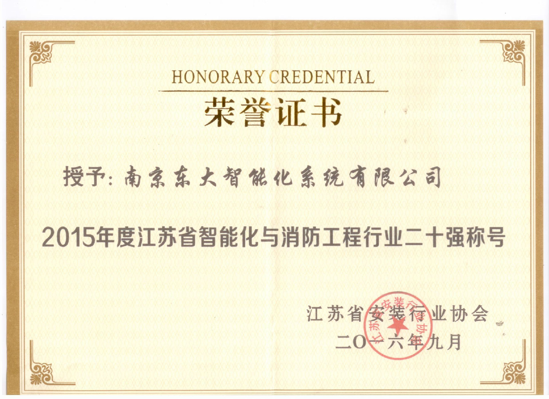 近日,江苏安装行业协会公布了“2015年度江苏省智能化与消防工程行业二十强企业”评选结果,南京东大智能化系统有限公司再次被授予“2015年度智能化与消防工程行业二十强企业”称号。