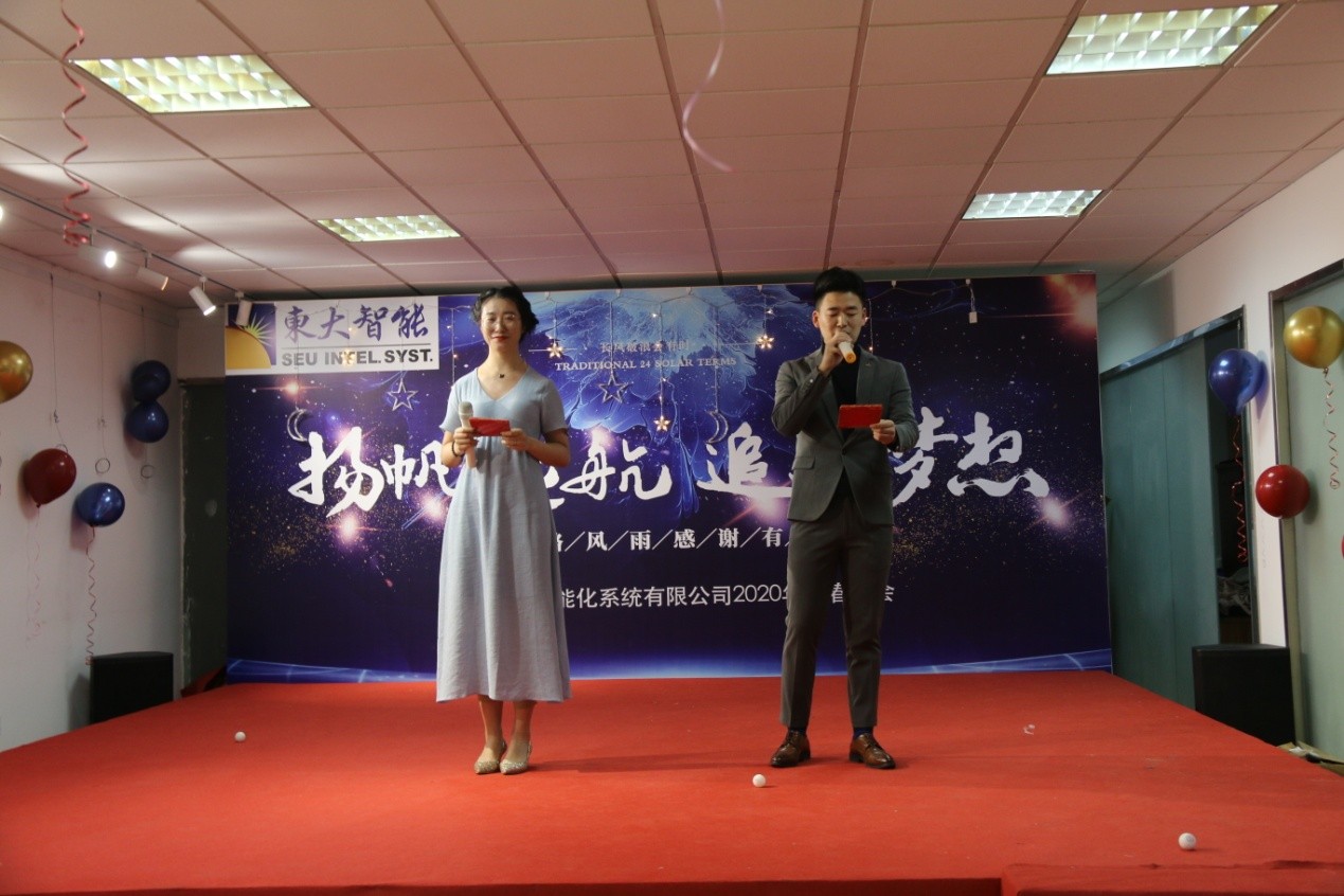 “火树银花迎玉鼠,山珍海味列金盘。”转瞬间2019年已迈着坚定的脚步离我们远去,而充满希望的2020年正缓缓走来,在这辞旧迎新的喜庆日子里,东大智能化系统有限公司为了感谢全体员工一年来的辛劳和付出,于2020年1月18日在公司总部召开了“扬帆远航,追逐梦想”为主题的新春晚会。董事长、各部门领导及全体同事在喜庆、祥和、热烈的氛围中,齐聚一堂,共庆东大智能的辉煌成就!