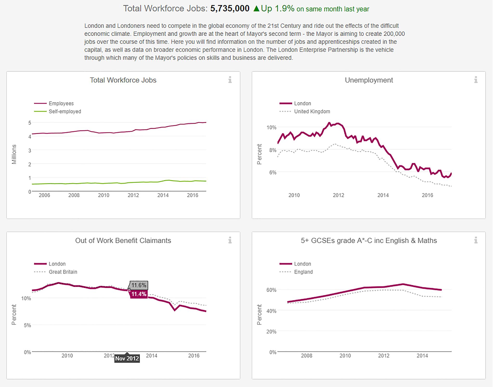 London DataStore界面(上图)及London DataStore基础数据分析(就业方面)(下图)资料来源:https://data.london.gov.uk/(伦敦政府数据网)