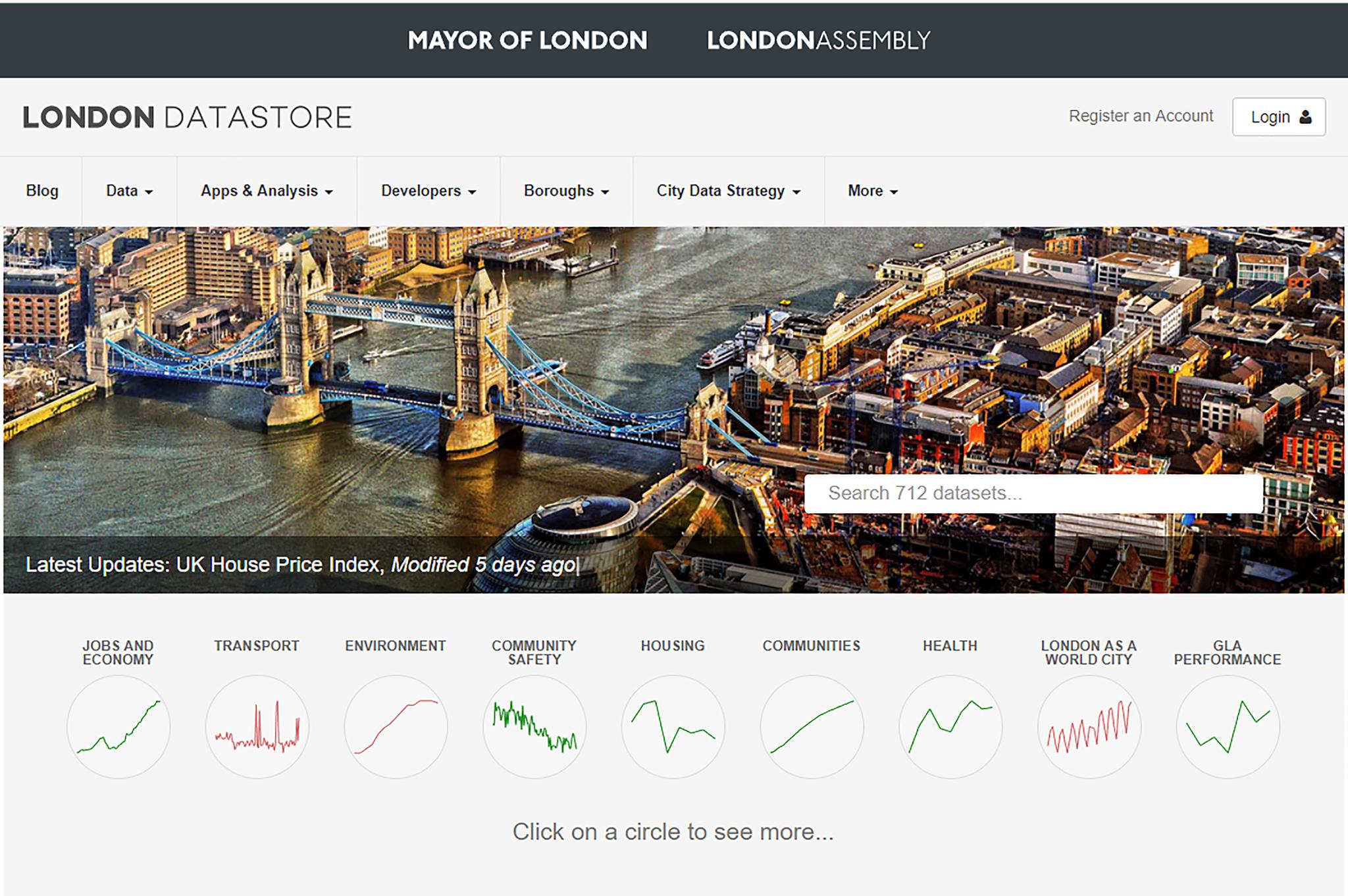 比如伦敦的London DataStore,这是一个免费的,对公共开放共享的数据资源库。数据信息涵盖整个城市的各方面,经济、就业、交通、环境、安全、房产、健康等。每个月50,000余名市民、商业机构、研究学者和开发者运用它来更好地规划和管理城市。