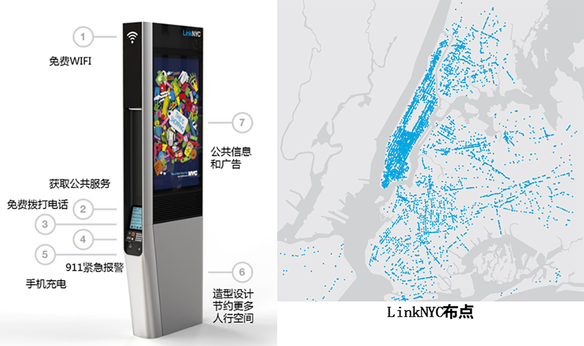 “连结纽约市 (Link NYC) ”是纽约市替代传统电话亭的一个计划。2016年起纽约市已经安装了7500多个高科技公共通信设备,它为纽约市民和游客提供免费服务,其功能不仅有免费Wi-Fi上网,还可以免费拨打电话、911紧急报警。设备中央有一台可用来联网的Android平板电脑,还有两个55寸荧屏,提供展示广告和推广公共服务。站点的网速高达一千兆位速度,距离站点150英尺范围内的用户都可以接收到Wi-Fi信号。