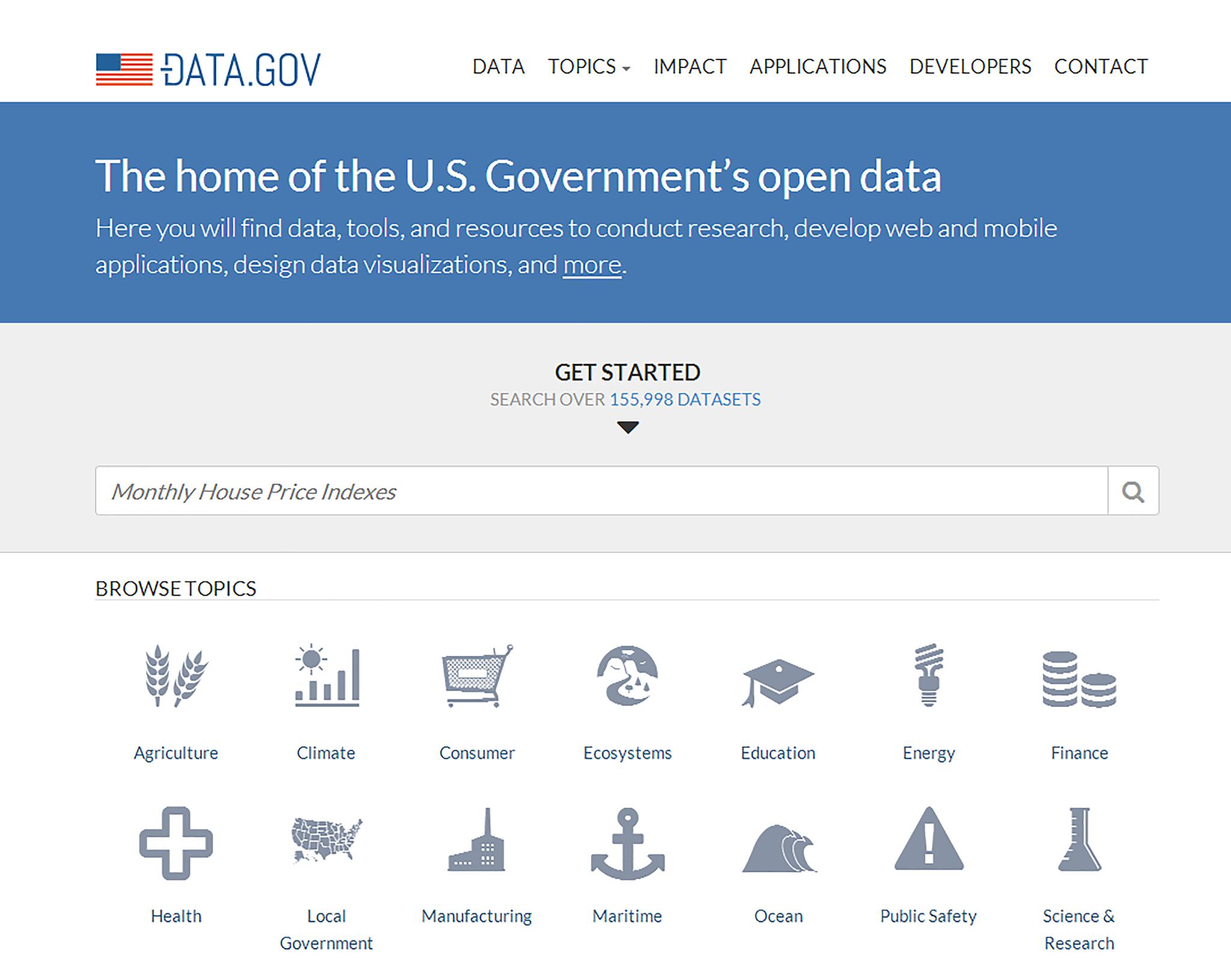 美国也有类似的数据开放平台。2009年奥巴马颁布了《透明与开放政府备忘录》与《信息自由法案备忘录》,同年联邦首席信息官委员会启动了data.gov项目作为所有政府信息的贮存库。目前data.gov上公开的数据集已达191836个,主要涵盖的数据群包括农业、商业、气候、消费、生态、教育、能源、金融、卫生健康、政府、制造业、海洋、公共安全、科学研究等领域。