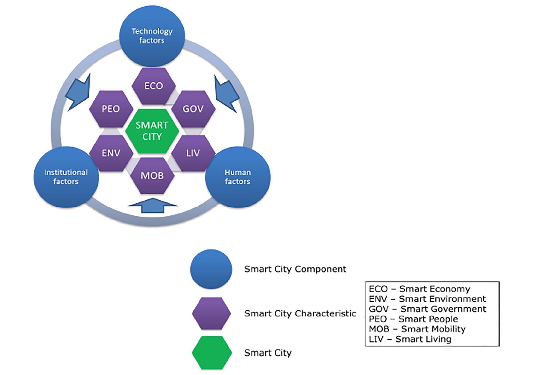 团队同时确定了欧盟智慧城市发展的3大元素以及6个主题。3大元素分别为技术因素、体制因素以及人的因素;6个主题包括智慧治理(Smart Governance)、智慧经济(Smart Economy)、智慧移动性(Smart Mobility)、智慧环境(Smart Environment)、智慧公众(Smart People)和智慧生活(Smart Living)。