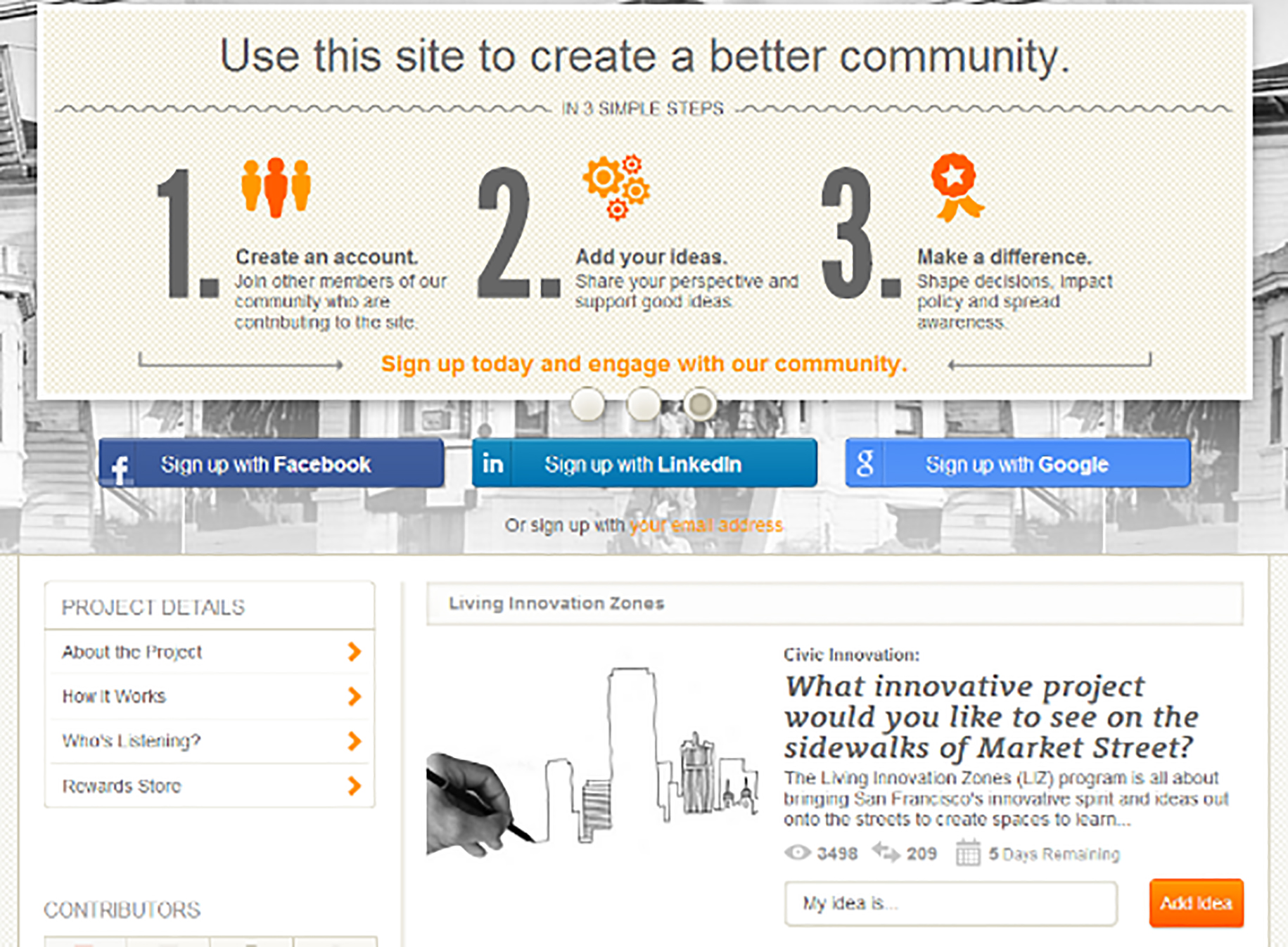 在美国,ImproveSF是旧金山市政府、议会、市科技局、市长社区服务办公室及旧金山本地的非盈利组织旧金山规划与城市更新会(SPUR)共同建立的网络平台。其运作模式是由社区组织或机构在ImproveSF网站上创建一个具体社区改造的项目,社区领袖会在项目页下阐释问题、主持并促进社区成员们对于问题的讨论,征集问题解决方案,最后选出最优方案并实施。目前,越来越多的社区问题被放在ImproveSF上寻求解决方案。