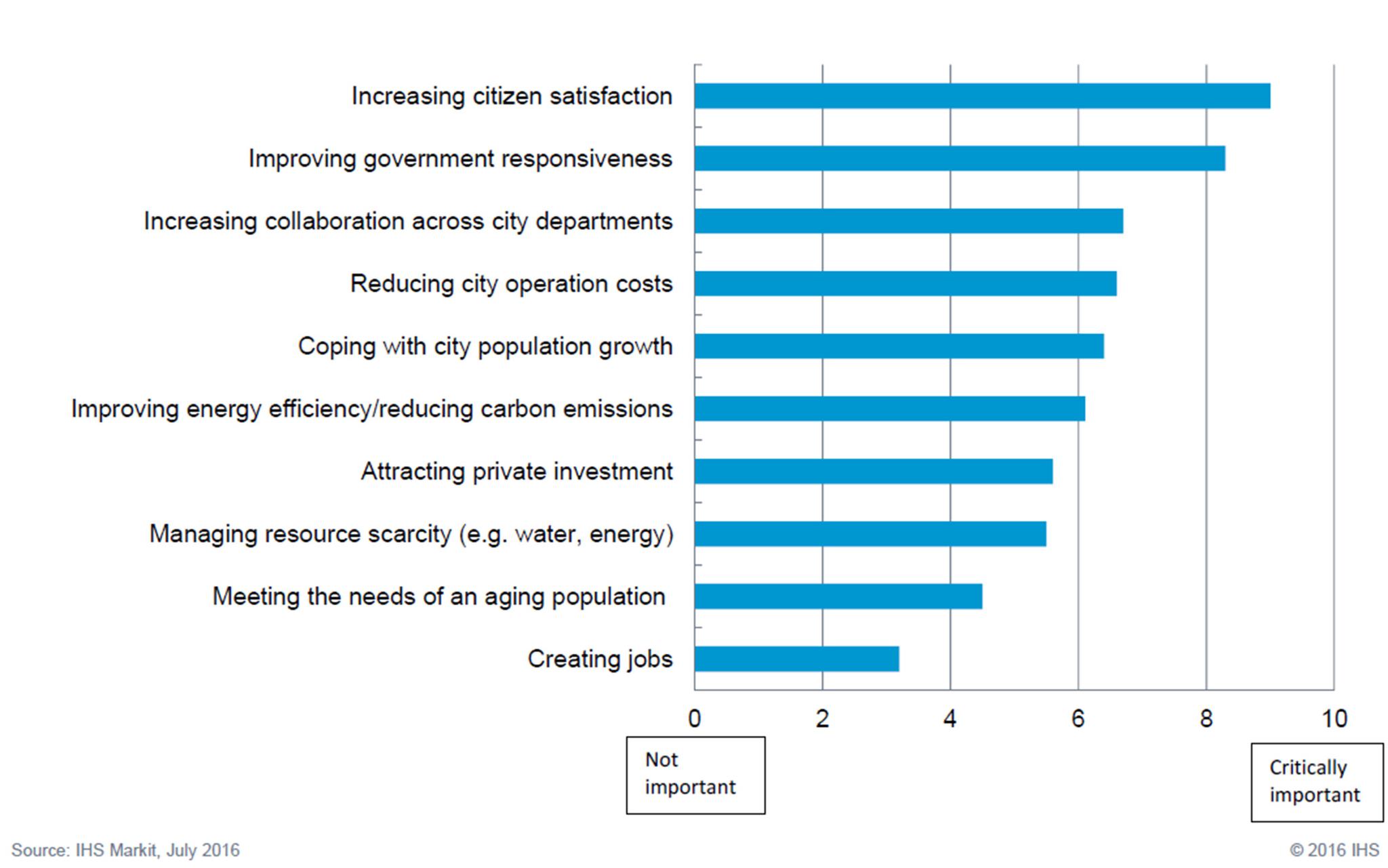 研究显示美国智慧城市项目的前两大首要目标是提高公民满意度(9.0)和政府应对能力(8.3)。