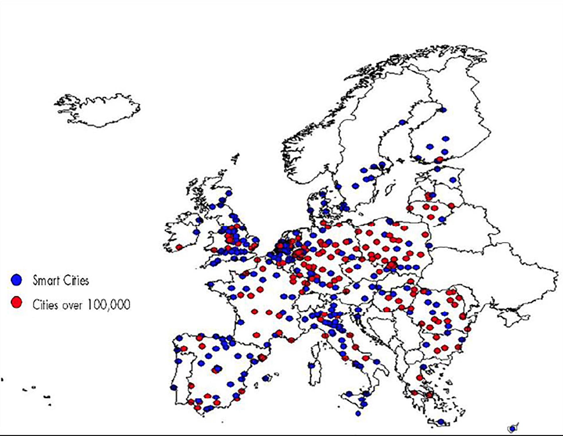 欧盟超过10万以上人口普通城市以及智慧城市位置示意图。资料来源:Mapping Smart Cities in the EU(欧盟智慧城市报告)