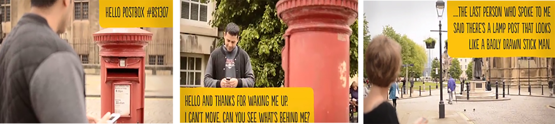 英国的布里斯托市崇尚“有趣的城市”。作为一个领先的技术创新中心,它将文化与科技结合,作为其城市创意经济发展的新型催化剂和连接器。布里斯托市的Hello Lamp Post项目通过一个简单的短信系统,邀请人们同熟悉的城市设施——灯柱、邮箱、公交站点等进行有意思的对话。在八周时间内,25000条短信被居民发送,人们“唤醒”了街道家具。每个等待被“唤醒”的街道家具上面均设有编号,人们只需编辑短信,发送这个编号,便开始与它们对话。城市就以这种创新的方式被描述和记录。