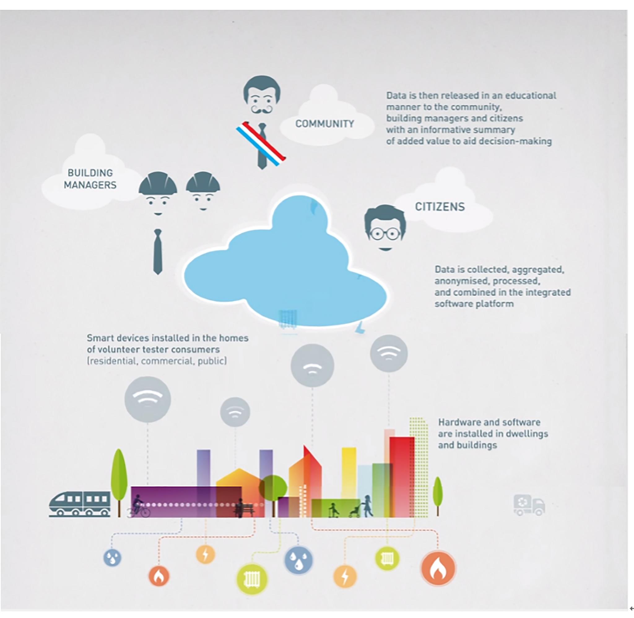 阿姆斯特丹的Viva Cité项目旨在形成一个城市和市民协作的能源数据管理工具。该工具能提供实时的能源产生、分配以及消耗的数据管理,能够以一种智能的方式管理城市能源使用。数据从在用户家庭或工作单位中安装的智能测量仪器中获取,收集后在平台融合,进而反馈给使用者、网络管理者等多方相关利益人,从而辅助决策。例如,物业管理者能够看到实时热、电、水等资源使用情况,辅助管线规划。