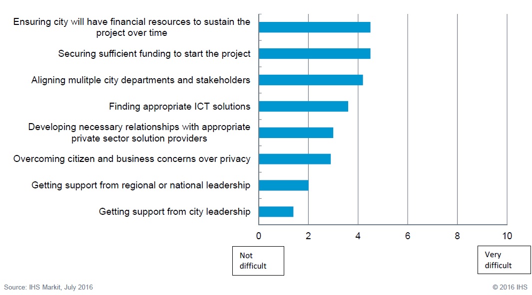 同时,该报告采用调查问卷的方法对智慧城市项目所面临的挑战及难易程度进行调查,数据显示智慧城市发展面临的前三大挑战是“确保城市有足够的资金维持项目全过程建设”(4.5),“获得足够的项目启动资金”(4.5)以及“协调多个城市部门和利益相关者“(4.2)。