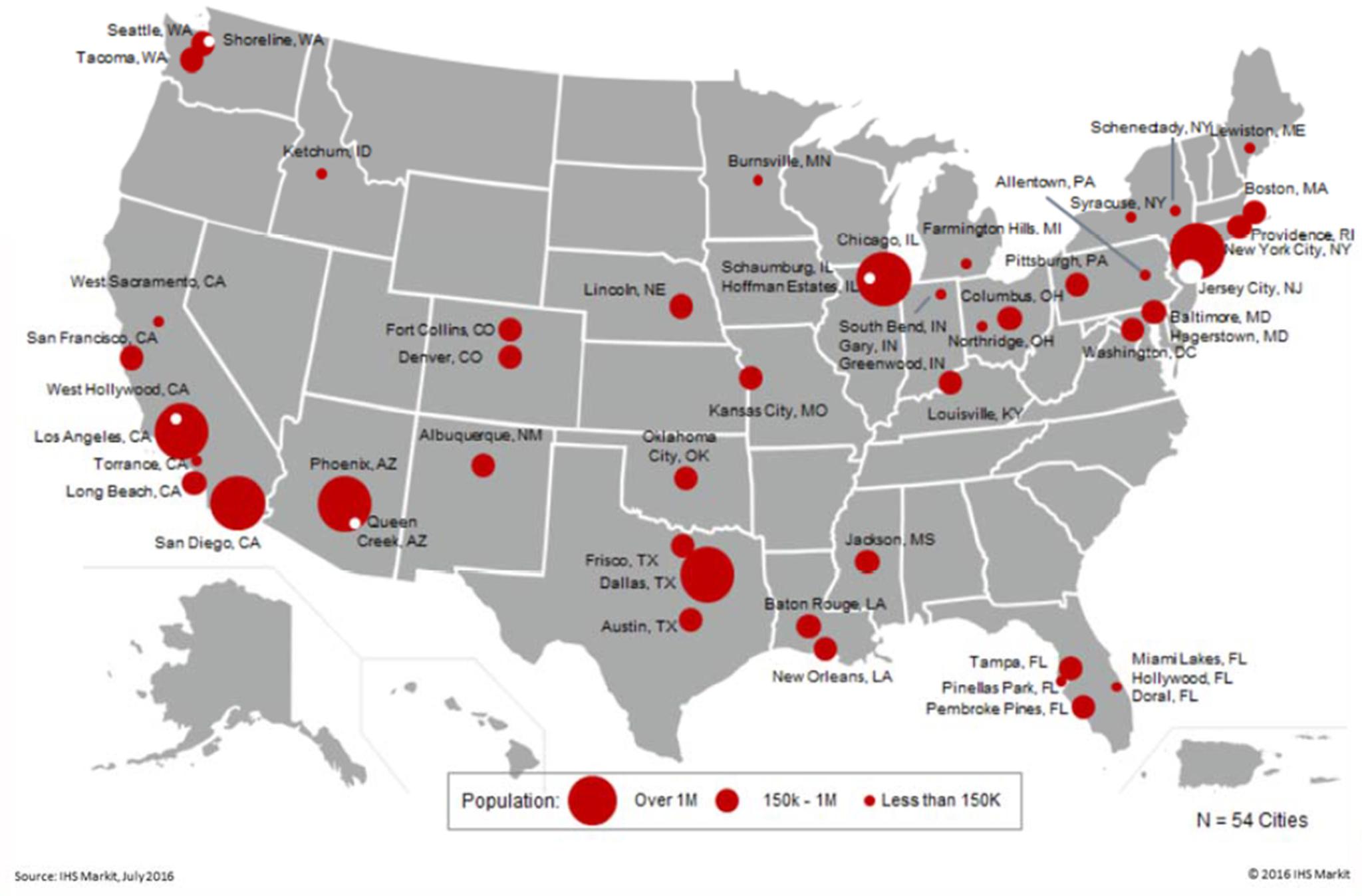 2016年,IHS Markit咨询公司就美国智慧城市发展状态进行深入调研,研究对象包括美国28个州的54个城市。